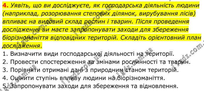 4. Уявіть, що ви досліджуєте, як господарська діяльність людини (наприклад, розорювання степових ділянок, вирубування лісів) впливає на видовий склад рослин і тварин. Після проведення дослідження ви маєте запропонувати заходи для збереження біорізноманіття відповідних територій. Складіть орієнтовний план дослідження. 1. Визначити види господарської діяльності на території. 2. Провести спостереження за змінами рослинності та тварин. 3. Порівняти отримані дані з природним станом територій. 4. Оцінити ступінь впливу людини на біорізноманіття. 5. Запропонувати заходи для збереження та відновлення.