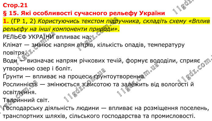 § 15. Які особливості сучасного рельефу України 1. (ГР 1, 2) Користуючись текстом підручника, складіть схему «Вплив рельєфу на інші компоненти природи». РЕЛЬЄФ УКРАЇНИ впливає на: Клімат — змінює напрям вітрів, кількість опадів, температуру повітря. Води — визначає напрям річкових течій, формує вододіли, сприяє утворенню озер і боліт. Ґрунти — впливає на процеси ґрунтоутворення. Рослинність — змінюється з висотою та залежить від вологості й освітлення. Тваринний світ. Господарську діяльність людини — впливає на розміщення поселень, транспортних шляхів, сільського господарства та промисловості.