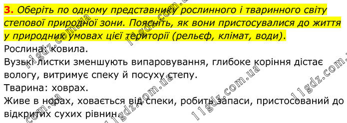 3. Оберіть по одному представнику рослинного і тваринного світу степової природної зони. Поясніть, як вони пристосувалися до життя у природних умовах цієї території (рельєф, клімат, води). Рослина: ковила. Вузькі листки зменшують випаровування, глибоке коріння дістає вологу, витримує спеку й посуху степу. Тварина: ховрах. Живе в норах, ховається від спеки, робить запаси, пристосований до відкритих сухих рівнин.