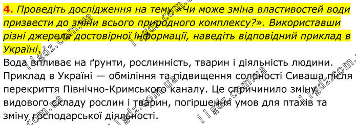 4. Проведіть дослідження на тему «Чи може зміна властивостей води призвести до зміни всього природного комплексу?». Використавши різні джерела достовірної інформації, наведіть відповідний приклад в Україні. Вода впливає на ґрунти, рослинність, тварин і діяльність людини. Приклад в Україні — обміління та підвищення солоності Сиваша після перекриття Північно-Кримського каналу. Це спричинило зміну видового складу рослин і тварин, погіршення умов для птахів та зміну господарської діяльності.