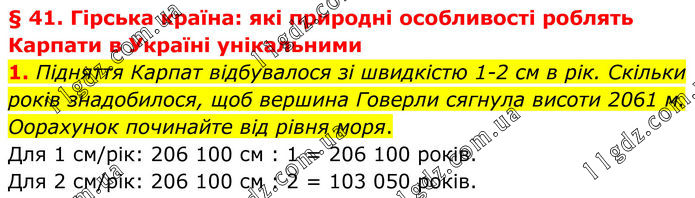 § 41. Гірська країна: які природні особливості роблять Карпати в Україні унікальними 1. Підняття Карпат відбувалося зі швидкістю 1-2 см в рік. Скільки років знадобилося, щоб вершина Говерли сягнула висоти 2061 м. Оорахунок починайте від рівня моря. Для 1 см/рік: 206 100 см : 1 = 206 100 років. Для 2 см/рік: 206 100 см : 2 = 103 050 років.