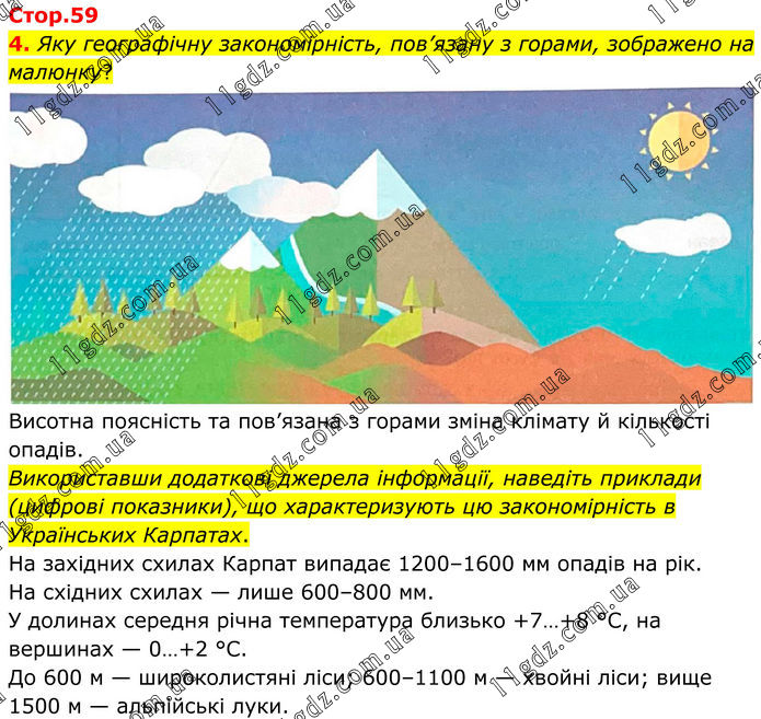 4. Яку географічну закономірність, пов’язану з горами, зображено на малюнку? Висотна поясність та пов’язана з горами зміна клімату й кількості опадів. Використавши додаткові джерела інформації, наведіть приклади (цифрові показники), що характеризують цю закономірність в Українських Карпатах. На західних схилах Карпат випадає 1200–1600 мм опадів на рік. На східних схилах — лише 600–800 мм. У долинах середня річна температура близько +7…+8 °C, на вершинах — 0…+2 °C. До 600 м — широколистяні ліси; 600–1100 м — хвойні ліси; вище 1500 м — альпійські луки.
