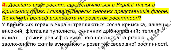 4. Дослідіть види рослин, що зустрічаються в Україні тільки в Кримських горах, і складіть перелік типових представників флори. Як клімат і рельєф впливають на розвиток рослинності? У Кримських горах в Україні трапляються сосна кримська, ялівець високий, фісташка туполиста, суничник дрібноплідний; теплий клімат і гірський рельєф із висотною поясністю та різною зволоженістю схилів зумовлюють розвиток своєрідної рослинності.
