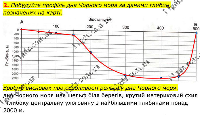 2. Побудуйте профіль дна Чорного моря за даними глибин, позначених на карті. Зробіть висновок про особливості рельєфу дна Чорного моря. Дно Чорного моря має шельф біля берегів, крутий материковий схил і глибоку центральну улоговину з найбільшими глибинами понад 2000 м.