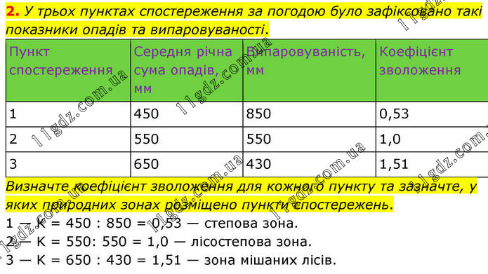 2. У трьох пунктах спостереження за погодою було зафіксовано такі показники опадів та випаровуваності. Пункт спостереження Середня річна сума опадів, мм Випаровуваність, мм Коефіцієнт зволоження 1 450 850 0,53 2 550 550 1,0 3 650 430 1,51 Визначте коефіцієнт зволоження для кожного пункту та зазначте, у яких природних зонах розміщено пункти спостережень. 1 — К = 450 : 850 = 0,53 — степова зона. 2 — K = 550: 550 = 1,0 — лісостепова зона. 3 — K = 650 : 430 = 1,51 — зона мішаних лісів.