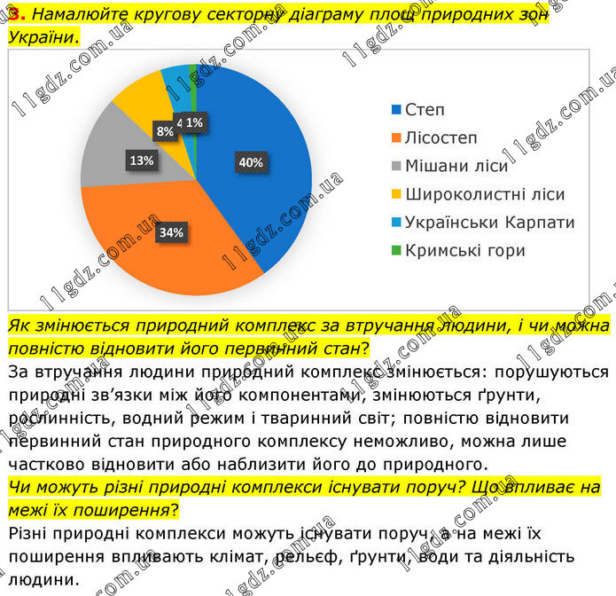 3. Намалюйте кругову секторну діаграму площ природних зон України. Як змінюється природний комплекс за втручання людини, і чи можна повністю відновити його первинний стан? За втручання людини природний комплекс змінюється: порушуються природні зв’язки між його компонентами, змінюються ґрунти, рослинність, водний режим і тваринний світ; повністю відновити первинний стан природного комплексу неможливо, можна лише частково відновити або наблизити його до природного. Чи можуть різні природні комплекси існувати поруч? Що впливає на межі їх поширення? Різні природні комплекси можуть існувати поруч, а на межі їх поширення впливають клімат, рельєф, ґрунти, води та діяльність людини.