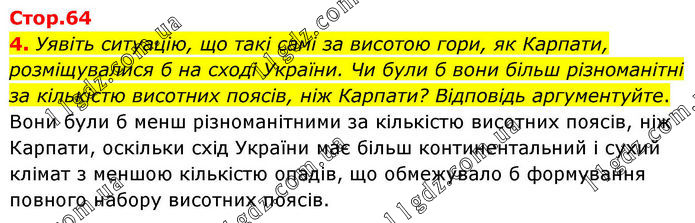 4. Уявіть ситуацію, що такі самі за висотою гори, як Карпати, розміщувалися б на сході України. Чи були б вони більш різноманітні за кількістю висотних поясів, ніж Карпати? Відповідь аргументуйте. Вони були б менш різноманітними за кількістю висотних поясів, ніж Карпати, оскільки схід України має більш континентальний і сухий клімат з меншою кількістю опадів, що обмежувало б формування повного набору висотних поясів.