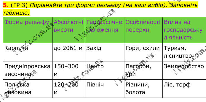 5. (ГР 3) Порівняйте три форми рельєфу (на ваш вибір). Заповніть таблицю. Форма рельєфу Абсолютні висоти Географічне положення Особливості поверхні Вплив на господарську діяльність Карпати до 2061 м Захід Гори, схили Туризм, лісництво Придніпровська височина 150–300 м Центр Пагорби, яри Землеробство Поліська низовина 120–200 м Північ Рівнини, болота Ліс, торф
