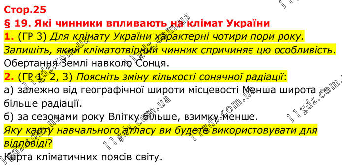 § 19. Які чинники впливають на клімат України 1. (ГР 3) Для клімату України характерні чотири пори року. Запишіть, який кліматотвірний чинник спричиняє цю особливість. Обертання Землі навколо Сонця. 2. (ГР 1, 2, 3) Поясніть зміну кількості сонячної радіації: а) залежно від географічної широти місцевості Менша широта — більше радіації. б) за сезонами року Влітку більше, взимку менше. Яку карту навчального атласу ви будете використовувати для відповіді? Карта кліматичних поясів світу.