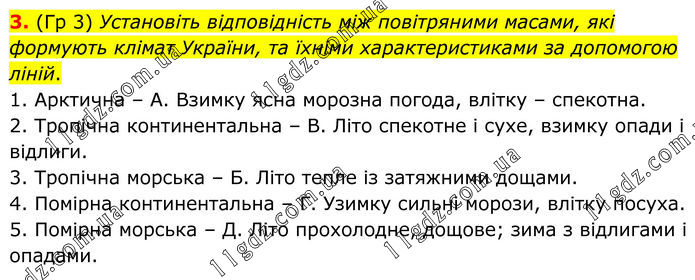 3. (Гр 3) Установіть відповідність між повітряними масами, які формують клімат України, та їхніми характеристиками за допомогою ліній. 1. Арктична – А. Взимку ясна морозна погода, влітку – спекотна. 2. Тропічна континентальна – В. Літо спекотне і сухе, взимку опади і відлиги. 3. Тропічна морська – Б. Літо тепле із затяжними дощами. 4. Помірна континентальна – Г. Узимку сильні морози, влітку посуха. 5. Помірна морська – Д. Літо прохолодне, дощове; зима з відлигами і опадами.