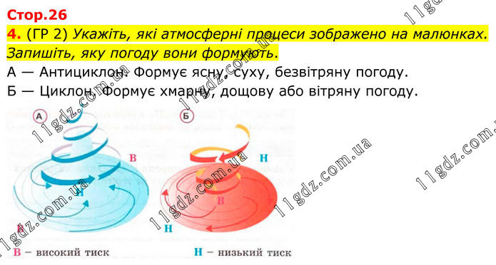 4. (ГР 2) Укажіть, які атмосферні процеси зображено на малюнках. Запишіть, яку погоду вони формують. А — Антициклон. Формує ясну, суху, безвітряну погоду. Б — Циклон. Формує хмарну, дощову або вітряну погоду.