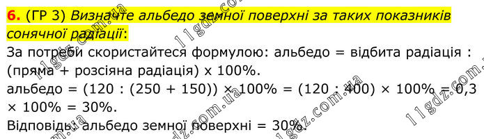 6. (ГР 3) Визначте альбедо земної поверхні за таких показників сонячної радіації: За потреби скористайтеся формулою: альбедо = відбита радіація : (пряма + розсіяна радіація) х 100%. альбедо = (120 : (250 + 150)) × 100% = (120 : 400) × 100% = 0,3 × 100% = 30%. Відповідь: альбедо земної поверхні = 30%.