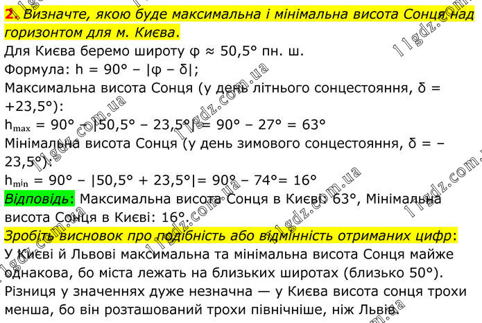 2. Визначте, якою буде максимальна і мінімальна висота Сонця над горизонтом для м. Києва. Для Києва беремо широту φ ≈ 50,5° пн. ш. Формула: h = 90° – |φ – δ|; Максимальна висота Сонця (у день літнього сонцестояння, δ = +23,5°): hₘₐₓ = 90° – |50,5° – 23,5°| = 90° – 27° = 63° Мінімальна висота Сонця (у день зимового сонцестояння, δ = –23,5°): hₘᵢₙ = 90° – |50,5° + 23,5°|= 90° – 74°= 16° Відповідь: Максимальна висота Сонця в Києві: 63°, Мінімальна висота Сонця в Києві: 16°. Зробіть висновок про подібність або відмінність отриманих цифр: У Києві й Львові максимальна та мінімальна висота Сонця майже однакова, бо міста лежать на близьких широтах (близько 50°). Різниця у значеннях дуже незначна — у Києва висота сонця трохи менша, бо він розташований трохи північніше, ніж Львів.