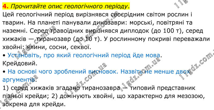 4. Прочитайте опис геологічного періоду. Цей геологічний період вирізнявся своєрідним світом рослин і тварин. На планеті панували динозаври: морські, повітряні та наземні. Серед травоїдних вирізнявся диплодок (до 100 т), серед хижаків — тиранозавр (до 10 т). У рослинному покриві переважали хвойні: ялини, сосни, секвої. • Установіть, про який геологічний період йде мова. Крейдовий. • На основі чого зроблений висновок. Назвіть не менше двох аргументів. 1) серед хижаків згадано тиранозавра — типовий представник пізньої крейди; 2) домінують хвойні, що характерно для мезозою, зокрема для крейди.