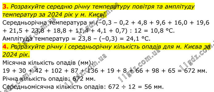 3. Розрахуйте середню річну температуру повітря та амплітуду температур за 2024 рік у м. Києві. Середньорічна температура = (–0,3 – 0,2 + 4,8 + 9,6 + 16,0 + 19,6 + 21,5 + 23,8 + 18,8 + 11,4 + 4,1 + 0,7) : 12 = 10,8 °C. Амплітуда температур = 23,8 – (–0,3) = 24,1 °C. 4. Розрахуйте річну і середньорічну кількість опадів для м. Києва за 2024 рік. Місячна кількість опадів (мм): 19 + 30 + 42 + 102 + 87 + 136 + 19 + 8 + 66 + 98 + 65 = 672 мм. Річна кількість опадів: 672 мм. Середньомісячна кількість опадів: 672 ÷ 12 = 56 мм.