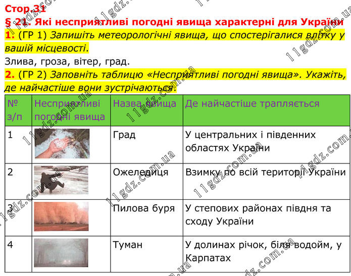 § 21. Які несприятливі погодні явища характерні для України 1. (ГР 1) Запишіть метеорологічні явища, що спостерігалися влітку у вашій місцевості. Злива, гроза, вітер, град. 2. (ГР 2) Заповніть таблицю «Несприятливі погодні явища». Укажіть, де найчастіше вони зустрічаються.