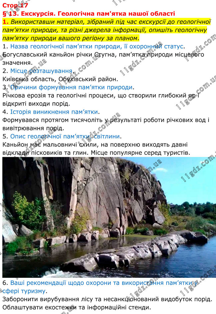 § 13. Екскурсія. Геологічна пам'ятка нашої області 1. Використавши матеріал, зібраний під час екскурсії до геологічної пам’ятки природи, та різні джерела інформації, опишіть геологічну пам’ятку природи вашого регіону за планом. 1. Назва геологічної пам’ятки природи, її охоронний статус. Богуславський каньйон річки Стугна, пам’ятка природи місцевого значення. 2. Місце розташування . Київська область, Обухівський район. 3. Причини формування пам’ятки природи. Річкова ерозія та геологічні процеси, що створили глибокий яр і відкриті виходи порід. 4. Історія виникнення пам’ятки. Формувався протягом тисячоліть у результаті роботи річкових вод і вивітрювання порід. 5. Опис геологічної пам’ятки, світлини. Каньйон має мальовничі схили, на поверхню виходять давні відклади пісковиків та глин. Місце популярне серед туристів. 6. Ваші рекомендації щодо охорони та використання пам’ятки у сфері туризму. Заборонити вирубування лісу та несанкціонований видобуток порід. Облаштувати екостежки та інформаційні стенди.