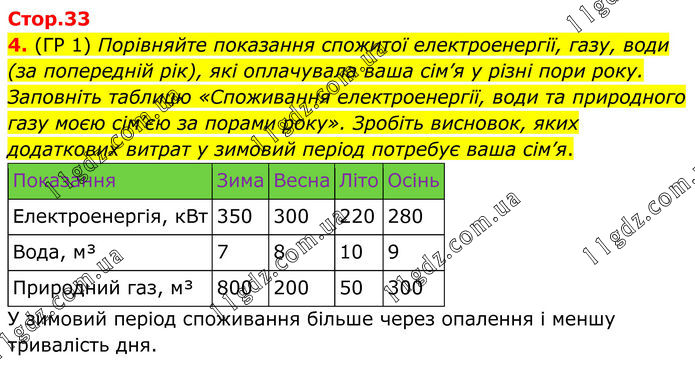 4. (ГР 1) Порівняйте показання спожитої електроенергії, газу, води (за попередній рік), які оплачувала ваша сім’я у різні пори року. Заповніть таблицю «Споживання електроенергії, води та природного газу моєю сім’єю за порами року». Зробіть висновок, яких додаткових витрат у зимовий період потребує ваша сім’я. Показання Зима Весна Літо Осінь Електроенергія, кВт 350 300 220 280 Вода, м³ 7 8 10 9 Природний газ, м³ 800 200 50 300 У зимовий період споживання більше через опалення і меншу тривалість дня.