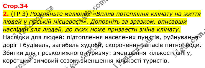Стор.34 2. (ГР 3) Розгляньте малюнок «Вплив потепління клімату на життя людей у гірській місцевості». Доповніть за зразком, вписавши наслідки для людей, до яких може призвести зміна клімату. Наслідки для людей: підтоплення населених пунктів, руйнування доріг і будівель, загибель худоби, скорочення запасів питної води. Збитки для гірськолижного туризму: зменшення кількості снігу, коротший зимовий сезон, зменшення кількості туристів.