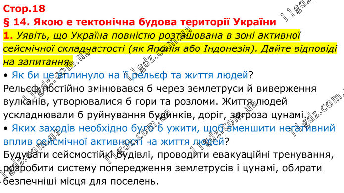 § 14. Якою е тектонічна будова території України 1. Уявіть, що Україна повністю розташована в зоні активної сейсмічної складчастості (як Японія або Індонезія). Дайте відповіді на запитання. • Як би це вплинуло на її рельєф та життя людей? Рельєф постійно змінювався б через землетруси й виверження вулканів, утворювалися б гори та розломи. Життя людей ускладнювали б руйнування будинків, доріг, загроза цунамі. • Яких заходів необхідно було б ужити, щоб зменшити негативний вплив сейсмічної активності на життя людей? Будувати сейсмостійкі будівлі, проводити евакуаційні тренування, розробити систему попередження землетрусів і цунамі, обирати безпечніші місця для поселень.