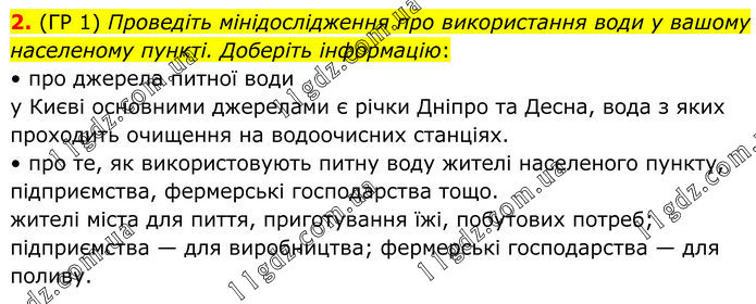 2. (ГР 1) Проведіть мінідослідження про використання води у вашому населеному пункті. Доберіть інформацію: • про джерела питної води у Києві основними джерелами є річки Дніпро та Десна, вода з яких проходить очищення на водоочисних станціях. • про те, як використовують питну воду жителі населеного пункту, підприємства, фермерські господарства тощо. жителі міста для пиття, приготування їжі, побутових потреб; підприємства — для виробництва; фермерські господарства — для поливу.