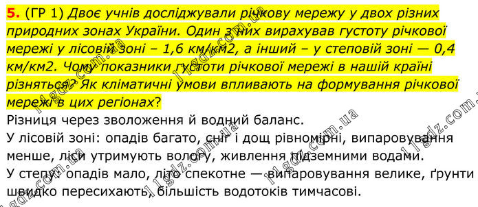 5. (ГР 1) Двоє учнів досліджували річкову мережу у двох різних природних зонах України. Один з них вирахував густоту річкової мережі у лісовій зоні – 1,6 км/км2, а інший – у степовій зоні — 0,4 км/км2. Чому показники густоти річкової мережі в нашій країні різняться? Як кліматичні умови впливають на формування річкової мережі в цих регіонах? Різниця через зволоження й водний баланс. У лісовій зоні: опадів багато, сніг і дощ рівномірні, випаровування менше, ліси утримують вологу, живлення підземними водами. У степу: опадів мало, літо спекотне — випаровування велике, ґрунти швидко пересихають, більшість водотоків тимчасові.