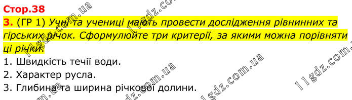 3. (ГР 1) Учні та учениці мають провести дослідження рівнинних та гірських річок. Сформулюйте три критерії, за якими можна порівняти ці річки. 1. Швидкість течії води. 2. Характер русла. 3. Глибина та ширина річкової долини.