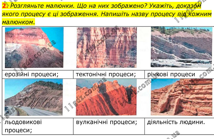 2. Розгляньте малюнки. Що на них зображено? Укажіть, доказом якого процесу є ці зображення. Напишіть назву процесу під кожним малюнком. ерозійні процеси; тектонічні процеси; річкові процеси льодовикові процеси; вулканічні процеси; діяльність людини.
