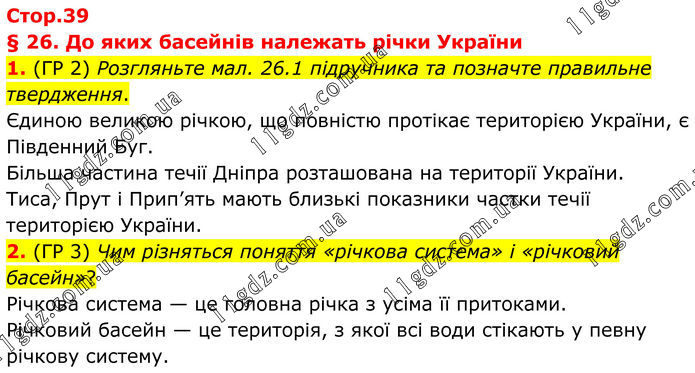 § 26. До яких басейнів належать річки України 1. (ГР 2) Розгляньте мал. 26.1 підручника та позначте правильне твердження. Єдиною великою річкою, що повністю протікає територією України, є Південний Буг. Більша частина течії Дніпра розташована на території України. Тиса, Прут і Прип’ять мають близькі показники частки течії територією України. 2. (ГР 3) Чим різняться поняття «річкова система» і «річковий басейн»? Річкова система — це головна річка з усіма її притоками. Річковий басейн — це територія, з якої всі води стікають у певну річкову систему.