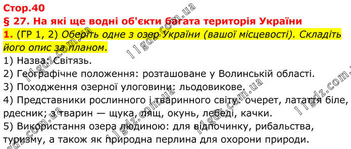 § 27. На які ще водні об'єкти багата територія України 1. (ГР 1, 2) Оберіть одне з озер України (вашої місцевості). Складіть його опис за планом. 1) Назва: Світязь. 2) Географічне положення: розташоване у Волинській області. 3) Походження озерної улоговини: льодовикове. 4) Представники рослинного і тваринного світу: очерет, латаття біле, рдесник; з тварин — щука, лящ, окунь, лебеді, качки. 5) Використання озера людиною: для відпочинку, рибальства, туризму, а також як природна перлина для охорони природи.