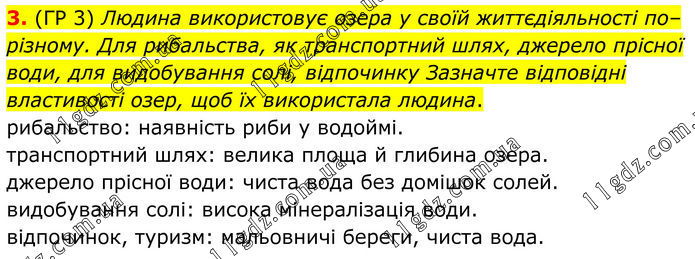3. (ГР 3) Людина використовує озера у своїй життєдіяльності по–різному. Для рибальства, як транспортний шлях, джерело прісної води, для видобування солі, відпочинку Зазначте відповідні властивості озер, щоб їх використала людина. рибальство: наявність риби у водоймі. транспортний шлях: велика площа й глибина озера. джерело прісної води: чиста вода без домішок солей. видобування солі: висока мінералізація води. відпочинок, туризм: мальовничі береги, чиста вода.
