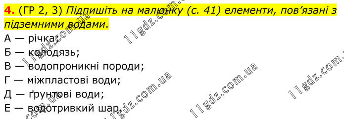 4. (ГР 2, 3) Підпишіть на малюнку (с. 41) елементи, пов’язані з підземними водами. А — річка; Б — колодязь; В — водопроникні породи; Г — міжпластові води; Д — ґрунтові води; Е — водотривкий шар.