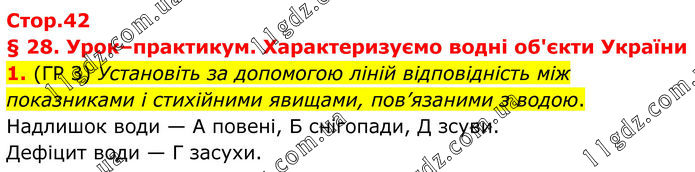 § 28. Урок–практикум. Характеризуємо водні об'єкти України 1. (ГР 3) Установіть за допомогою ліній відповідність між показниками і стихійними явищами, пов’язаними з водою. Надлишок води — А повені, Б снігопади, Д зсуви. Дефіцит води — Г засухи.