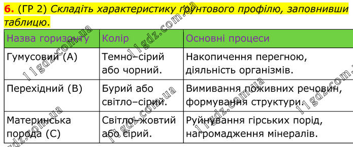 6. (ГР 2) Складіть характеристику ґрунтового профілю, заповнивши таблицю. Назва горизонту Колір Основні процеси Гумусовий (A) Темно–сірий або чорний. Накопичення перегною, діяльність організмів. Перехідний (B) Бурий або світло–сірий. Вимивання поживних речовин, формування структури. Материнська порода (C) Світло–жовтий або сірий. Руйнування гірських порід, нагромадження мінералів.
