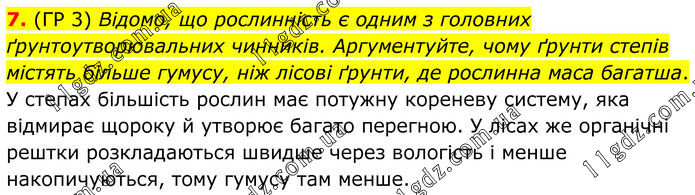 7. (ГР 3) Відомо, що рослинність є одним з головних ґрунтоутворювальних чинників. Аргументуйте, чому ґрунти степів містять більше гумусу, ніж лісові ґрунти, де рослинна маса багатша. У степах більшість рослин має потужну кореневу систему, яка відмирає щороку й утворює багато перегною. У лісах же органічні рештки розкладаються швидше через вологість і менше накопичуються, тому гумусу там менше.