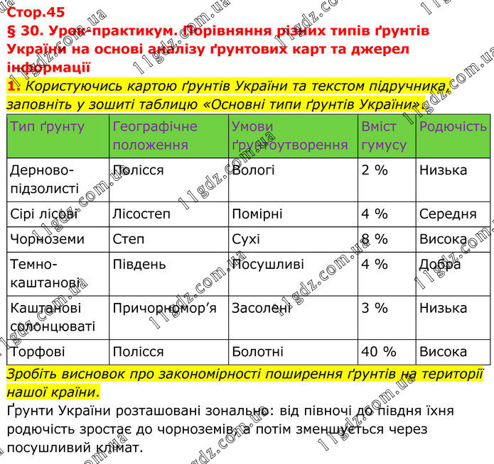 § 30. Урок-практикум. Порівняння різних типів ґрунтів України на основі аналізу ґрунтових карт та джерел інформації 1. Користуючись картою ґрунтів України та текстом підручника, заповніть у зошиті таблицю «Основні типи ґрунтів України». Тип ґрунту Географічне положення Умови ґрунтоутворення Вміст гумусу Родючість Дерново-підзолисті Полісся Вологі 2 % Низька Сірі лісові Лісостеп Помірні 4 % Середня Чорноземи Степ Сухі 8 % Висока Темно-каштанові Південь Посушливі 4 % Добра Каштанові солонцюваті Причорномор’я Засолені 3 % Низька Торфові Полісся Болотні 40 % Висока Зробіть висновок про закономірності поширення ґрунтів на території нашої країни. Ґрунти України розташовані зонально: від півночі до півдня їхня родючість зростає до чорноземів, а потім зменшується через посушливий клімат.