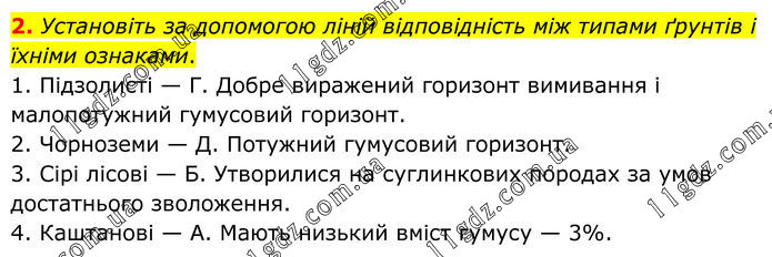 2. Установіть за допомогою ліній відповідність між типами ґрунтів і їхніми ознаками. 1. Підзолисті — Г. Добре виражений горизонт вимивання і малопотужний гумусовий горизонт. 2. Чорноземи — Д. Потужний гумусовий горизонт. 3. Сірі лісові — Б. Утворилися на суглинкових породах за умов достатнього зволоження. 4. Каштанові — А. Мають низький вміст гумусу — 3%.