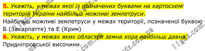5. Укажіть, у межах якої із позначених буквами на картосхемі територій України найбільш можливі землетруси. Найбільш можливі землетруси у межах території, позначеної буквою Б (Закарпаття) та Е (Крим) 6. Укажіть, у межах яких областей земна кора найбільш давня. Придніпровської височини.