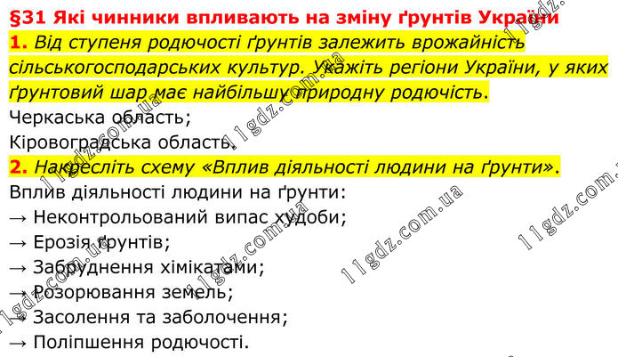 §31 Які чинники впливають на зміну ґрунтів України 1. Від ступеня родючості ґрунтів залежить врожайність сільськогосподарських культур. Укажіть регіони України, у яких ґрунтовий шар має найбільшу природну родючість. Черкаська область; Кіровоградська область. 2. Накресліть схему «Вплив діяльності людини на ґрунти». Вплив діяльності людини на ґрунти: → Неконтрольований випас худоби; → Ерозія ґрунтів; → Забруднення хімікатами; → Розорювання земель; → Засолення та заболочення; → Поліпшення родючості.