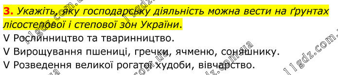 3. Укажіть, яку господарську діяльність можна вести на ґрунтах лісостепової і степової зон України. V Рослинництво та тваринництво. V Вирощування пшениці, гречки, ячменю, соняшнику. V Розведення великої рогатої худоби, вівчарство.