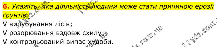 6. Укажіть, яка діяльність людини може стати причиною ерозії ґрунтів. V вирубування лісів; V розорювання вздовж схилу; V контрольований випас худоби.