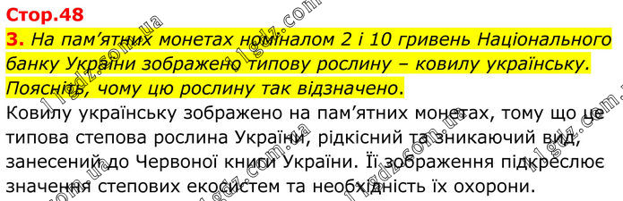 3. На пам’ятних монетах номіналом 2 і 10 гривень Національного банку України зображено типову рослину – ковилу українську. Поясніть, чому цю рослину так відзначено. Ковилу українську зображено на пам’ятних монетах, тому що це типова степова рослина України, рідкісний та зникаючий вид, занесений до Червоної книги України. Її зображення підкреслює значення степових екосистем та необхідність їх охорони.