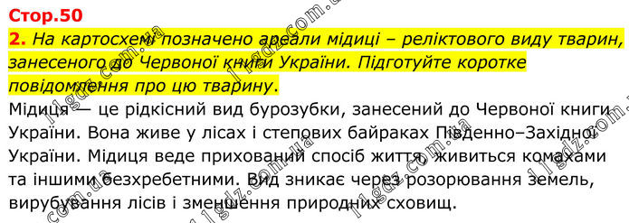2. На картосхемі позначено ареали мідиці – реліктового виду тварин, занесеного до Червоної книги України. Підготуйте коротке повідомлення про цю тварину. Мідиця — це рідкісний вид бурозубки, занесений до Червоної книги України. Вона живе у лісах і степових байраках Південно–Західної України. Мідиця веде прихований спосіб життя, живиться комахами та іншими безхребетними. Вид зникає через розорювання земель, вирубування лісів і зменшення природних сховищ.