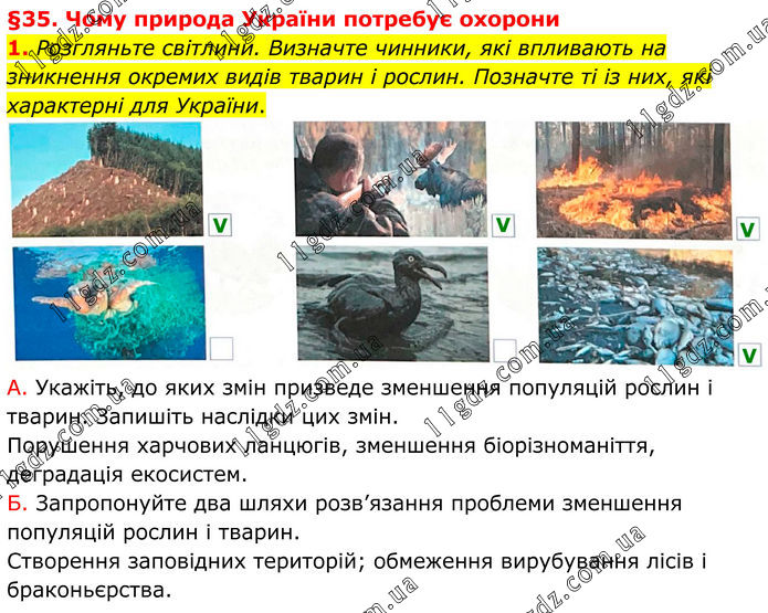 §35. Чому природа України потребує охорони 1. Розгляньте світлини. Визначте чинники, які впливають на зникнення окремих видів тварин і рослин. Позначте ті із них, які характерні для України. А. Укажіть, до яких змін призведе зменшення популяцій рослин і тварин. Запишіть наслідки цих змін. Порушення харчових ланцюгів, зменшення біорізноманіття, деградація екосистем. Б. Запропонуйте два шляхи розв’язання проблеми зменшення популяцій рослин і тварин. Створення заповідних територій; обмеження вирубування лісів і браконьєрства.
