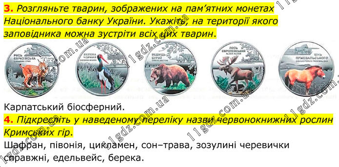 3. Розгляньте тварин, зображених на пам’ятних монетах Національного банку України. Укажіть, на території якого заповідника можна зустріти всіх цих тварин. Карпатський біосферний. 4. Підкресліть у наведеному переліку назви червонокнижних рослин Кримських гір. Шафран, півонія, цикламен, сон–трава, зозулині черевички справжні, едельвейс, берека.