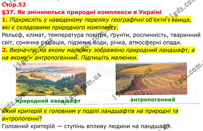 §37. Як змінюються природні комплекси в Україні 1. Підкресліть у наведеному переліку географічні об’єкти і явища, які є складовими природного комплексу. Рельєф, клімат, температура повітря, ґрунти, рослинність, тваринний світ, сонячна радіація, підземні води, річка, атмосферні опади. 2. Визначте, на якому малюнку зображено природний ландшафт, а на якому – антропогенний. Підпишіть малюнки. Який критерій є головним у поділі ландшафтів на природні та антропогенні? Головний критерій — ступінь впливу людини на ландшафт.
