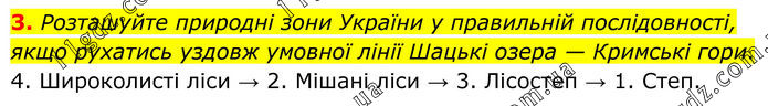 3. Розташуйте природні зони України у правильній послідовності, якщо рухатись уздовж умовної лінії Шацькі озера — Кримські гори. 4. Широколисті ліси → 2. Мішані ліси → 3. Лісостеп → 1. Степ.