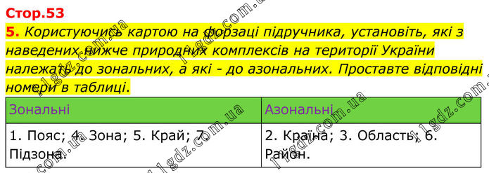 5. Користуючись картою на форзаці підручника, установіть, які з наведених нижче природних комплексів на території України належать до зональних, а які - до азональних. Проставте відповідні номери в таблиці. Зональні Азональні 1. Пояс; 4. Зона; 5. Край; 7. Підзона. 2. Країна; 3. Область; 6. Район.