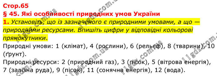 § 45. Які особливості природних умов України 1. Установіть, що із зазначеного є природними умовами, а що — природними ресурсами. Впишіть цифри у відповідні кольорові прямокутники. Природні умови: 1 (клімат), 4 (рослини), 6 (рельєф), 8 (тварини), 10 (ґрунт). Природні ресурси: 2 (природний газ), 3 (пісок), 5 (вітрова енергія), 7 (залізна руда), 9 (пісок), 11 (сонячна енергія), 12 (вода).