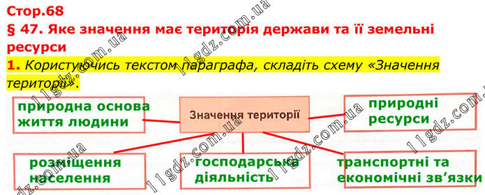 § 47. Яке значення має територія держави та її земельні ресурси 1. Користуючись текстом параграфа, складіть схему «Значення території».